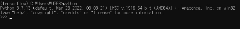이렇게 왼쪽에 (base)가 활성화시킨 가상환경의 이름인 (tensorflow)로 설정됨을 볼 수 있습니다.
